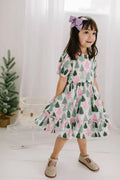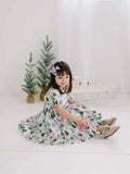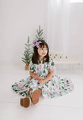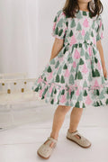 Ollie Jay Aura Dress features a puffed short sleeve with a ruffled arm opening detail and a full skirt with trim and a sweet ruffle as well as a zippered back made of 100% poplin cotton with a cotton liner. Wash in cold, lay flat to dry for longer wear
