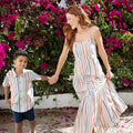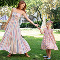 Show Your Stripes! An array of riviera-inspired, sun kissed stripes make a colorful statement in our versatile Multi Vintage Stripe shown here on ready for warmer weather Womens Marilyn Dress. This full length, form flattering tiered dress features adjustable skinny shoulder tie straps and forgiving smocking at the back. Fully lined with an invisible zipper closure at back this piece is as simple as it as elegant. Dress up with a strappy sandal and your favorite earring or wear with a flat sneaker for the school run. You'll find Multi Vintage Stripe throughout our Spring collection making Mommy & Me looks easy to coordinate.