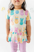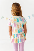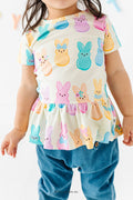 This playful peplum top features a cheerful PEEPS® bunny print in soft rainbow hues. With its flouncy hem and easy fit, it’s made for school days, egg hunts, and every spring moment in between.