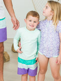 Our RuggedButts long sleeve rash guard top is great for active little guys. The UPF 50+ sun protective fabric and full coverage fit will keep him safe from the sun's harmful rays. The classic makes it easy to mix and match with your favorite RuggedButts swim trunks. The beautiful mint green color makes it easy to coordinate and create an adorable outfit. Care Instructions: Hand wash cold with like colors; do not bleach; do not iron; line dry in shade Fabric Content: 80% Nylon, 20% Spandex