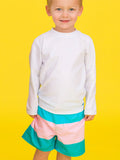 Complete your boy's summer swim outfit with these Swim Trunks. With its inner mesh lining and adjustable drawstrings on the inside, not only will he look good but feel good, too. Made with UPF 50+ sun protective fabric for all day protection and comfort. A classic colorblock, perfect on its own or for coordinating with our Pool Party collection! Pairs perfectly with Pink and Bright Aqua. Care Instructions: Machine wash cold with like colors; do not bleach; do not iron; line dry in shade Fabric Content: 100% Polyester
