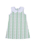 This timeless girls shift dress features a crisp white background with classic green vertical stripes accented by dainty pink floral motifs for a sweet, traditional look. Finished with a signature Peter Pan collar, this dress offers an heirloom-inspired style that feels both polished and playful.