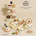 A delightful addition to any child's imaginative playtime, this wooden tea set is adorned with charming flora details and engraving, creating a whimsical and elegant aesthetic.