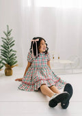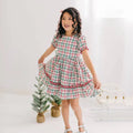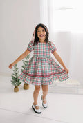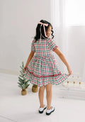 Ollie Jay Aura Dress features a puffed short sleeve with a ruffled arm opening detail and a full skirt with trim and a sweet ruffle as well as a zippered back made of 100% poplin cotton with a cotton liner. Wash in cold, lay flat to dry for longer wear