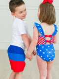 Complete your boy's summer swim outfit with these Swim Trunks. With its inner mesh lining and adjustable drawstrings on the inside, not only will he look good but feel good, too. Made with UPF 50+ sun protective fabric for all day protection and comfort. A classic colorblock, perfect on its own or for coordinating with the rest of our Americana collection! Pairs perfectly with Blue, Sonic Blue, and Vintage Red. Care Instructions: Machine wash cold with like colors; do not bleach; do not iron; line dry in shade Fabric Content: 100% Polyester