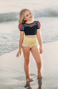 An adorable high waisted two piece swimsuit that provides modesty and features all of the princess details that your little one will love!
