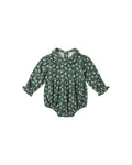 Sweet baby one-piece with a charming Peter Pan collar and long sleeves. Features bottom snaps and a back closure with four coconut buttons for easy changing.